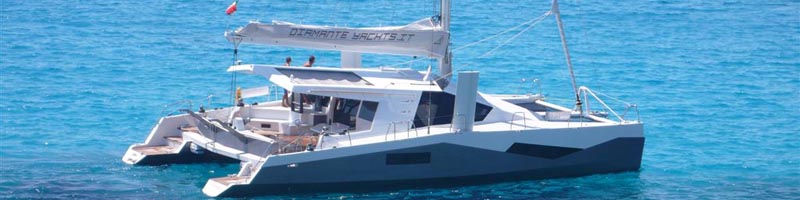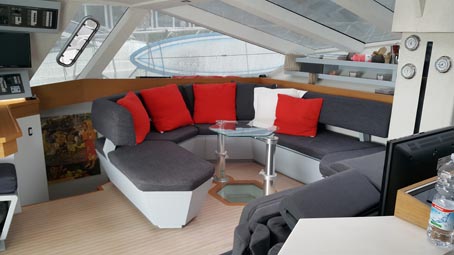 Diamante 555 adotta un sistema di abitabilità al top, assolutamente innovativo e fuori dagli standard per un catamarano. Uno spazio così non si era mai né progettato né pensato. Circa 35 mq di spazio continuo e senza interruzioni tra dinette e pozzetto. Una distanza impensabile in una imbarcazione di queste dimensioni. La dinette presenta soluzioni veramente uniche con una zona divano “trasformabile” in tre configurazioni diverse, per garantire ecletticità all’ambiente ed il massimo del comfort con una vista panoramica a 360°.